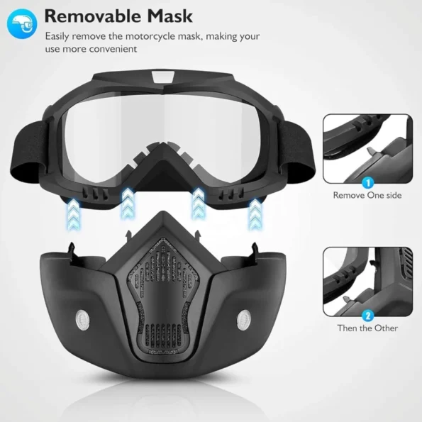 Hard Plastic Face-Mask Goggles with Dust-Mask for Bikers. Stylish goggles with detachable masks, so the goggles can be used alone. and the mask with slot and the goggles with slot hole which is easy to install and dismantle.